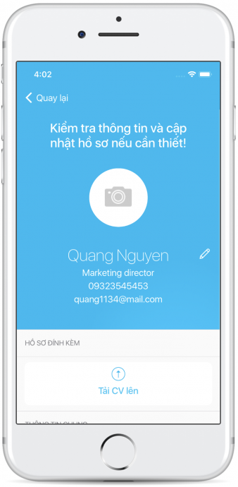 Create your profile easily on VietnamWorks Job Search App, get in touch with companies that are close to you and get an answer in less than 24h.